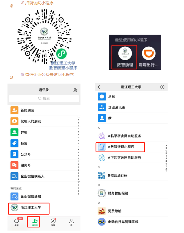 1. 数智浙理小程序:扫码访问小程序,或微信企业公众号访问小程序:微信通讯录→我的企业→浙江理工大学→数智浙理小程序。