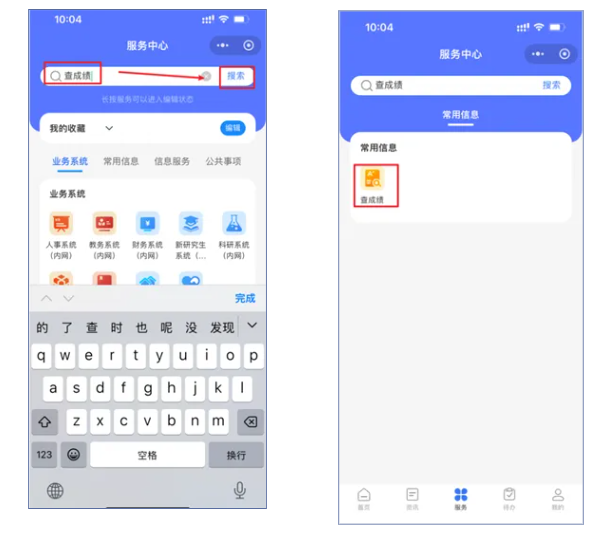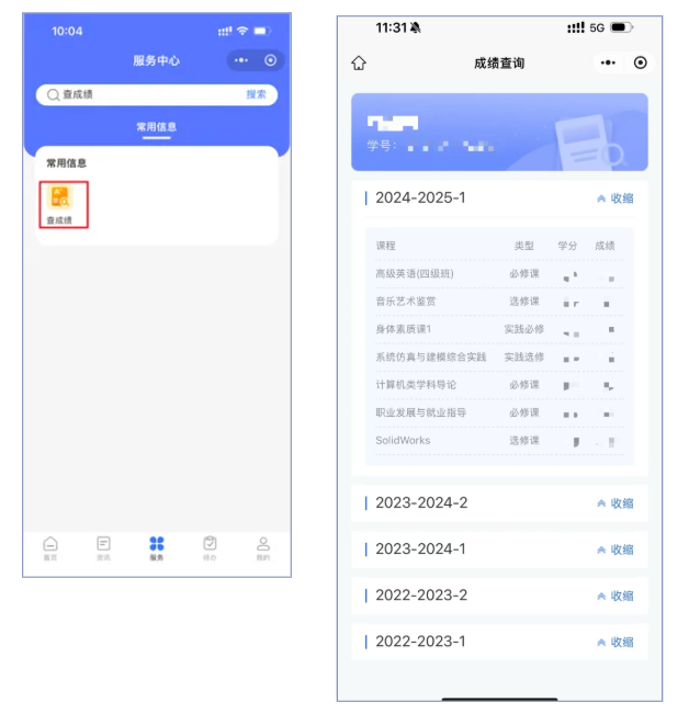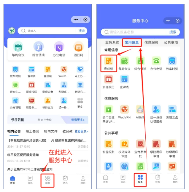 2. 小程序服务查成绩:小程序服务中心→常用信息→查成绩;或者直接搜索服务 “查成绩”