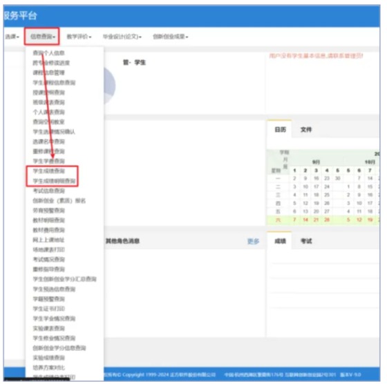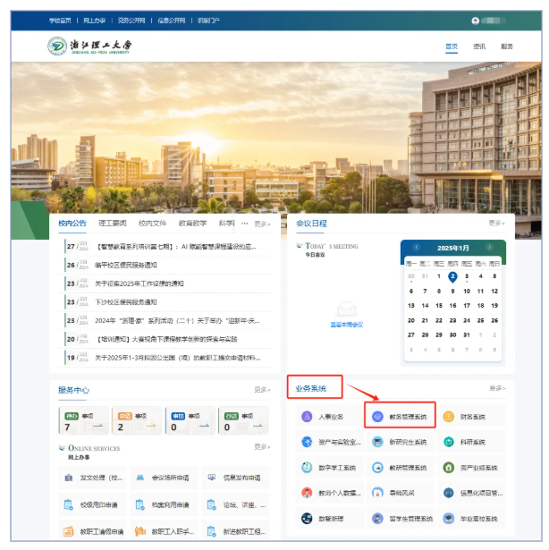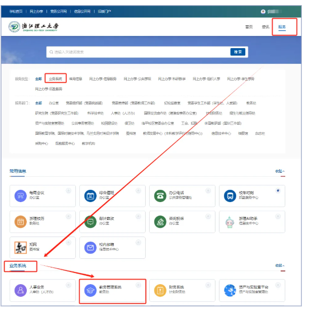 2. 校内网登录教务管理系统查成绩:门户首页→业务系统→教务管理系统;或者 门户首页右上服务→业务系统→教务管理系统