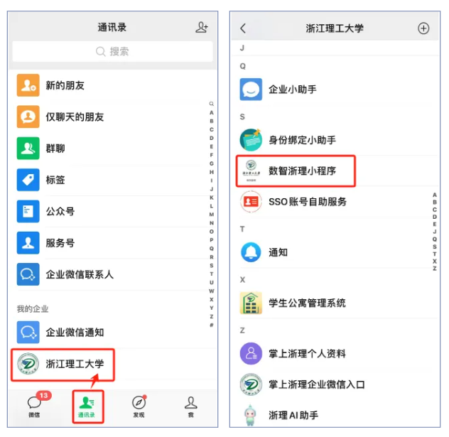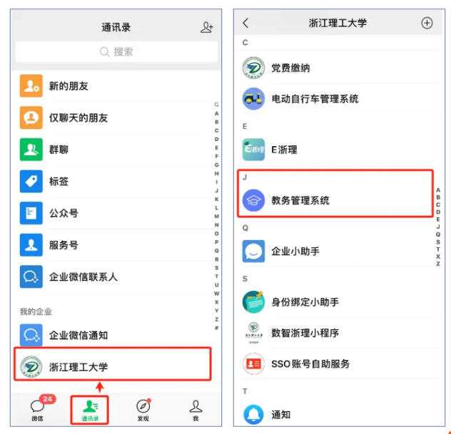 微信企业公众号查成绩:微信通讯录→我的企业→浙江理工大学→教务管理系统