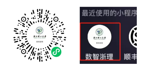 1. 小程序入口:扫描下方小程序二维码访问;或者 微信企业公众号小程序入口:微信通讯录→我的企业→浙江理工大学→数智浙理小程序