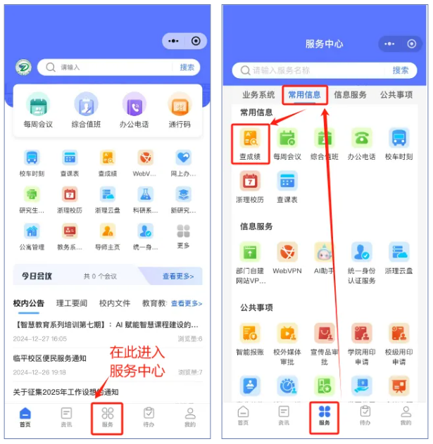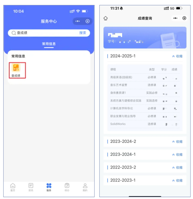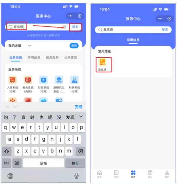 服务中心查成绩:服务中心→常用信息→查成绩 或者 直接搜索服务 “查成绩”,进入查成绩服务,详细查询成绩