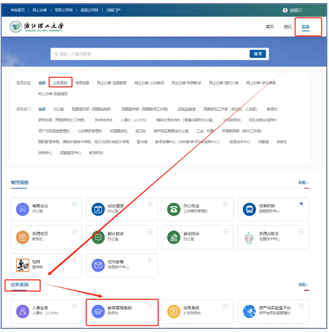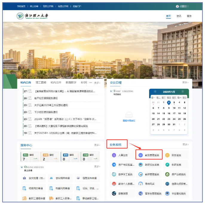 2 校内网登录教务管理系统:门户首页→业务系统→教务管理系统