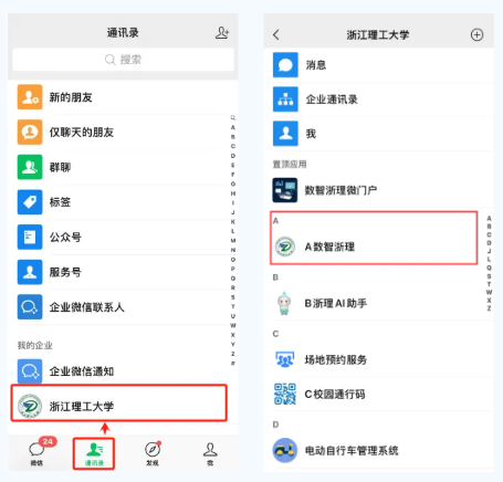 数智浙理入口:微信通讯录→我的企业→浙江理工大学→数智浙理