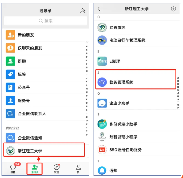 1 微信企业号教务管理入口:微信通讯录→我的企业→浙江理工大学→教务管理系统
